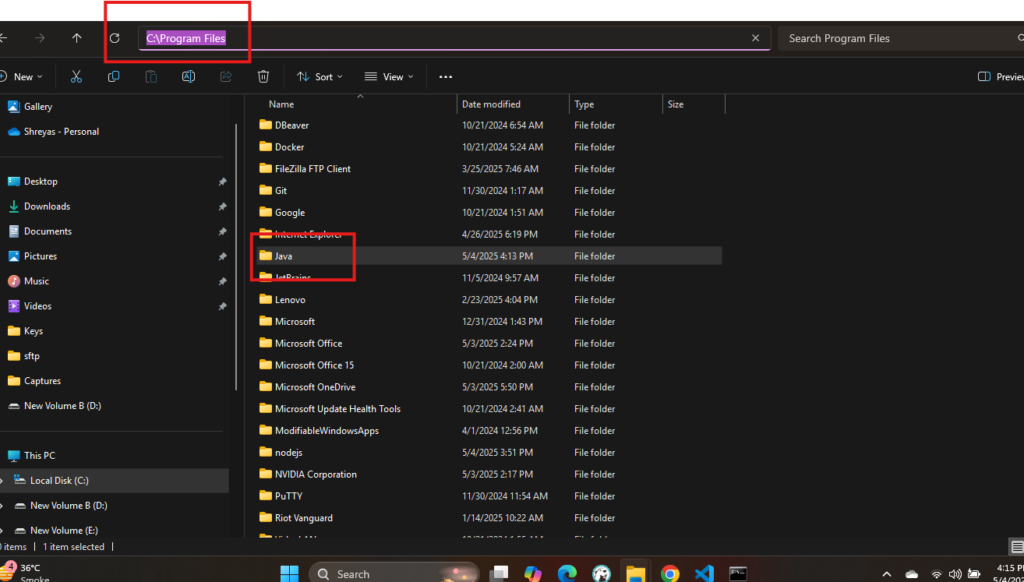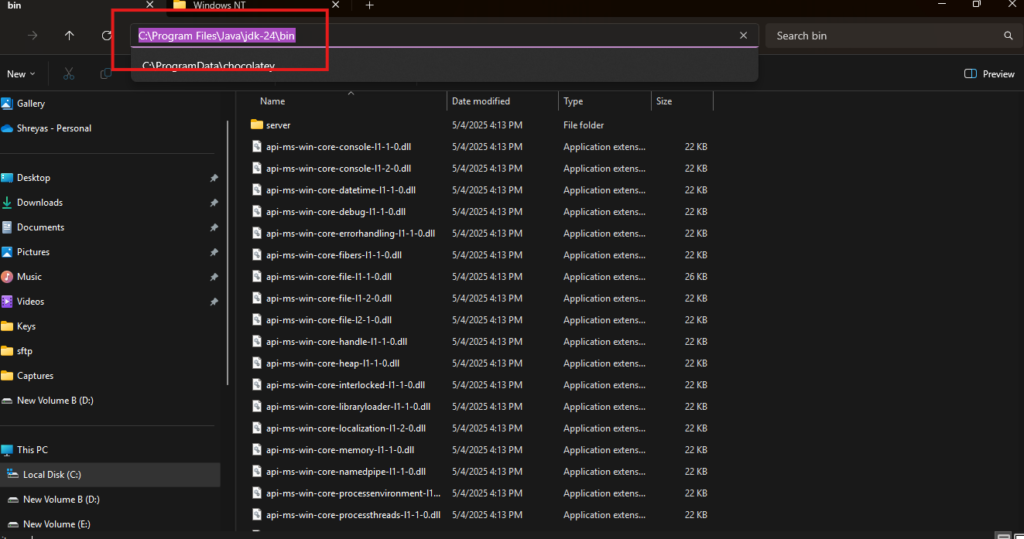 Step 3:- Next, navigate to C:\Program Files\Java, open the jdk-{installed verison}folder, then go to the bin directory. Copy the full path from the address bar, as shown in the screenshot below. In my case C:\Program Files\Java\jdk-24\bin