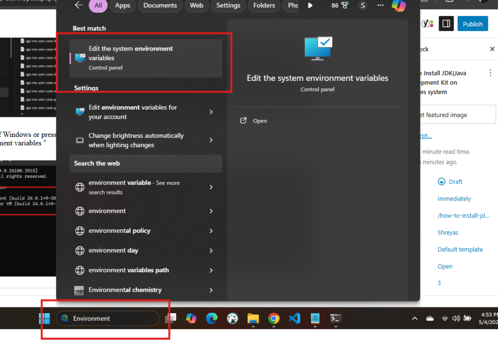 Step 4:- Click the Windows Start button or press the Windows key, then search for “Environment”. From the search results, select ‘Edit the system environment variables’. This will open the System Properties window. At the bottom, click the ‘Environment Variables…’ button.